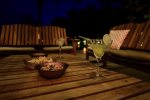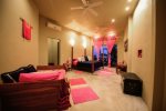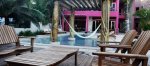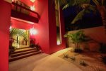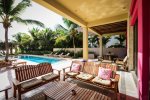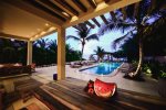 The pool area has an outdoor shower and seating area. At night, villa Alma Rosa 2,000 square foot roof has chaise lounges.